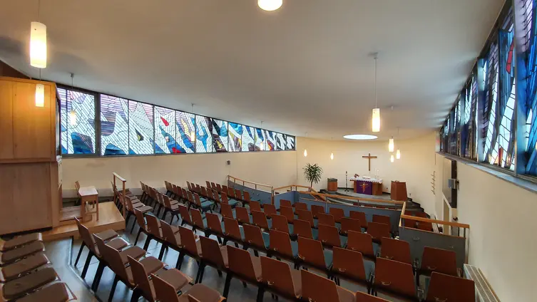 Die Kirche grenzt unmittelbar an den Friedhof an. Der Grundriss des Gotteshauses entspricht in etwa der Form einer in die Länge gezogenen Glocke. Flankiert wird sie vom ca. 15 m hohen Kirchturm, der aus vier stelzenartigen Stahlträgern besteht, den Glockenkasten beinhaltet und mit einem weithin sichtbaren Kreuz geschmückt ist.
