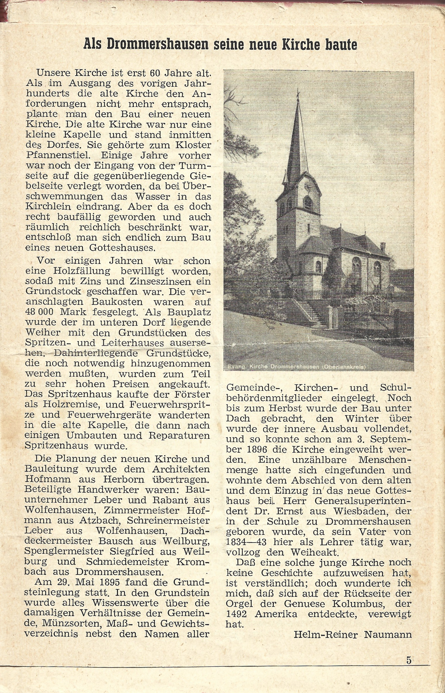 Bereits ab 1685 beklagen sich die Pfarrer immer wieder bei der zuständigen Konsistorialverwaltung in Weilburg über den Zustand der Drommershäuser Kapelle, die inzwischen zu klein für die gewachsene Bevölkerung geworden war und sich zudem in einem desolaten Zustand befand. Die Gemeinde, die meist aus Bergarbeitern bestand, war zu arm und konnte kaum die notwendigsten Reparaturen finanzieren. Aber erst 1893 kommen die Dinge unter Pfarrer Johannes Hahn (1892-1904 Pfarrer) in Gang. Im Februar wird der Bau beschlossen und ein Grundstücke für den Bauplatz inmitten des Ortes erworben. Der Kirchenbaumeister Ludwig Hoffmann aus Herborn wurde mit der Bauplanung beauftragt und legte seine beiden Alternativplanungen noch in diesem Jahr vor. Nachdem nochmals ein Jahr mit Verhandlungen über Finanzierung und Aussehen des Neubaus verstrichen war, konnte am 29. Mai 1895 der Grundstein zur neuen Kirche gelegt werden, der in die Fassade rechts des Portals eingelassen ist). Im August 1896 war der Bau fertig gestellt und sowohl Orgel wie Glocken konnten eingebaut werden. Der gesamte Bau mit seiner Ausstattung hat insgesamt circa 33.000 Mark gekostet. Am 3. September 1896 wurde die neue Kirche mit einem großen Dorffest eingeweiht. Die mittelalterliche Kapelle blieb erhalten und diente als Spritzenhaus, wurde jedoch in der Mitte der 60iger Jahre abgerissen, heute befindet sich an der Stelle das Dorfgemeinschaftshaus.