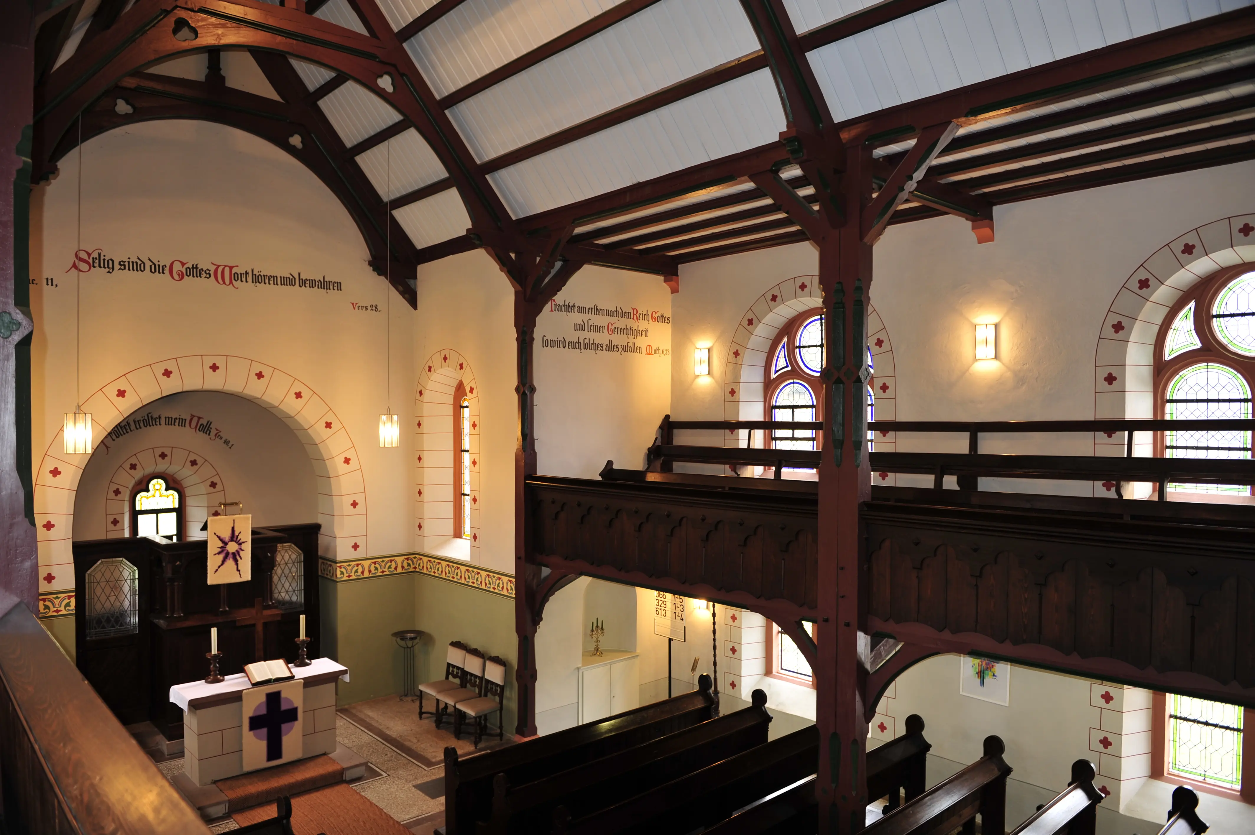 Der Altarbereich ist von der Apsis durch eine hölzerne befensterte Abschrankung mit der Kanzel getrennt. Sie ist aus dunkel gebeiztem Eichenholz, wobei die Kanzel Schmuckformen mit romanisierenden Säulchen mit Würfelkapitellen zeigt. Die Apsis selbst dient als Sakristei, so dass nur die Apsidenwölbung mit der Inschrift: „Tröstet, tröstet mein Volk“ Jes. 40,1, vom Kirchenraum zu sehen ist. Neben der Inschrift in der Apsiskalotte sind drei weitere Textstellen im Kirchenraum mit großen gotischen Lettern an den Wänden zu finden: An der linken Stirnwand der Empore steht das Bibelwort: „Kommet her zu mir alle, die ihr mühselig und beladen seid ich will euch erquicken Math. 11 Vers 28“, über dem Apsidenbogen lautet der Text: „Selig sind die Gottes Wort hören und bewahren Luk.11 Vers 28“ und an der rechten Emporenwand: „Trachtet am ersten nach dem Reich Gottes und nach seiner Gerechtigkeit so wird euch solches alles zufallen Math. 6 Vers 33“. So beziehen sich die alle drei Texte auf Jesu Einladung an die Menschheit und seine Verheißungen.