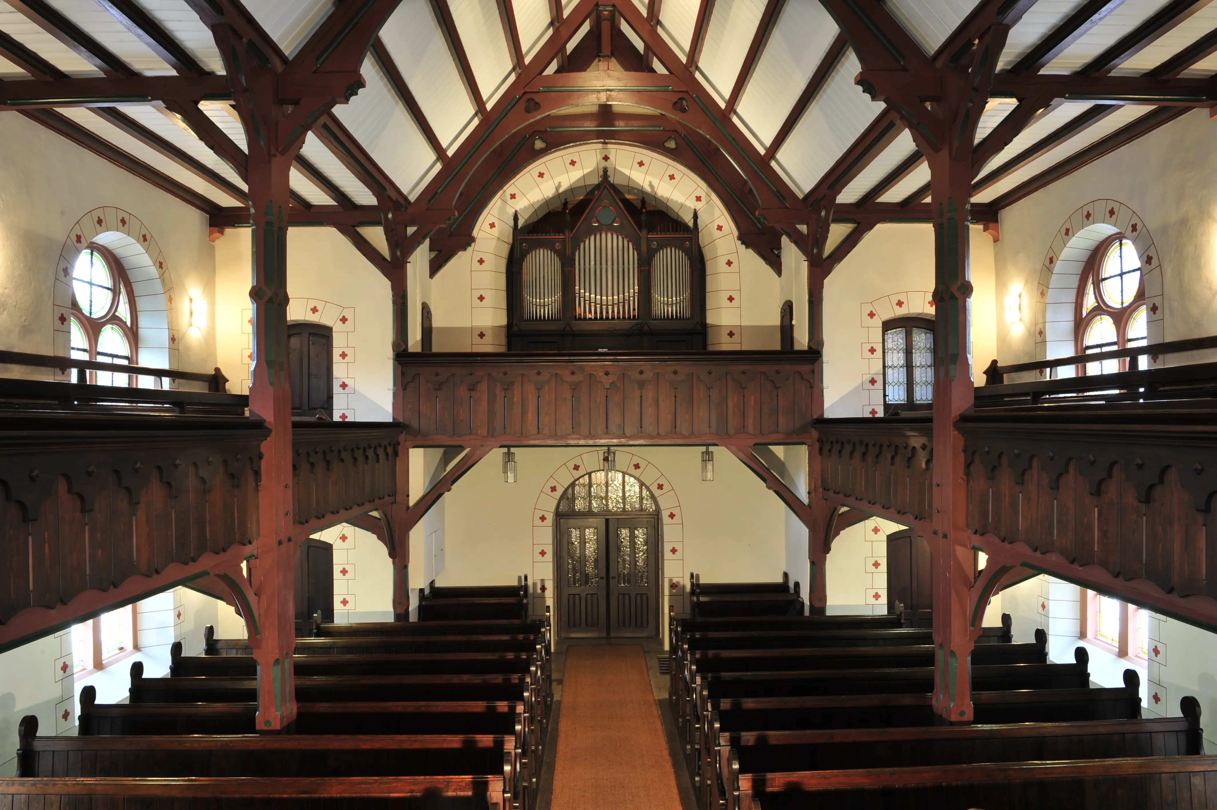 Das Innere des Gemeinderaumes ist ein breit gelagerter Saalraum, der jedoch durch die Art der Deckengestaltung sowie die beiden seitlichen, auf durchgehenden Stützen ruhenden Emporen den Eindruck einer dreischiffigen Staffelkirche erhält. Die hölzerne Decke ist besonders eindrucksvoll und einzigartig in der Region. Die Art ihrer Gestaltung ist beeinflusst von offenen Dachstühlen der britischen Neogotik, die ihrerseits heimische Vorbilder der späteren Gotik (sog. Hammerbeam Roofs) kopierten. Vermittelt über Veröffentlichungen in Bau- und Architekturzeitschriften nahm die Strömung der englischen Neugotik Einfluss auch auf den deutschen Historismus. Die horizontalen Deckenpartien über den Emporen tragen längs durchgehende Balken, während der Bereich der mittleren Längsachse dreieckig erhöht ist und durch sichtbare hölzerne Gespärre getragen wird. Die Decke wird zudem gestützt durch kräftige, profilierte und beschnitzte Holzstützen, die zugleich auch die Emporen tragen. Die hölzernen Brüstungen der Gemeinde- wie auch der Orgelempore zeigen Kleeblattbogenfriese. Die farbige Gestaltung der Wände ist ganz typisch für den Historismus, im Gemeindebereich ist sie jedoch äußerst zurückhaltend und beschränkt sich auf eine Quaderung der Bogenläufe der Fenster, wobei in jedem zweiten „Quader“ ein roter Vierpass erscheint. Der Chorraum ist ein eher schlichter Raumteil, in dessen Mitte der einfache Altarblock steht, jedoch ist er durch seine Wandbemalung mit einer farbigen Bordüre mit romanisierenden Rankenornamenten hervorgehoben. Da dieselbe Schablone verwandt wurde, wie bei einer der 1897 gemalten Schmuckbänder der ev. Kirche von Altenkirchen, waren hier mit Sicherheit dieselben Handwerker beschäftigt, nämlich die Malermeister Heinrich Demmer, Wetzlar, und sein Bruder W. Demmer aus Philippstein.