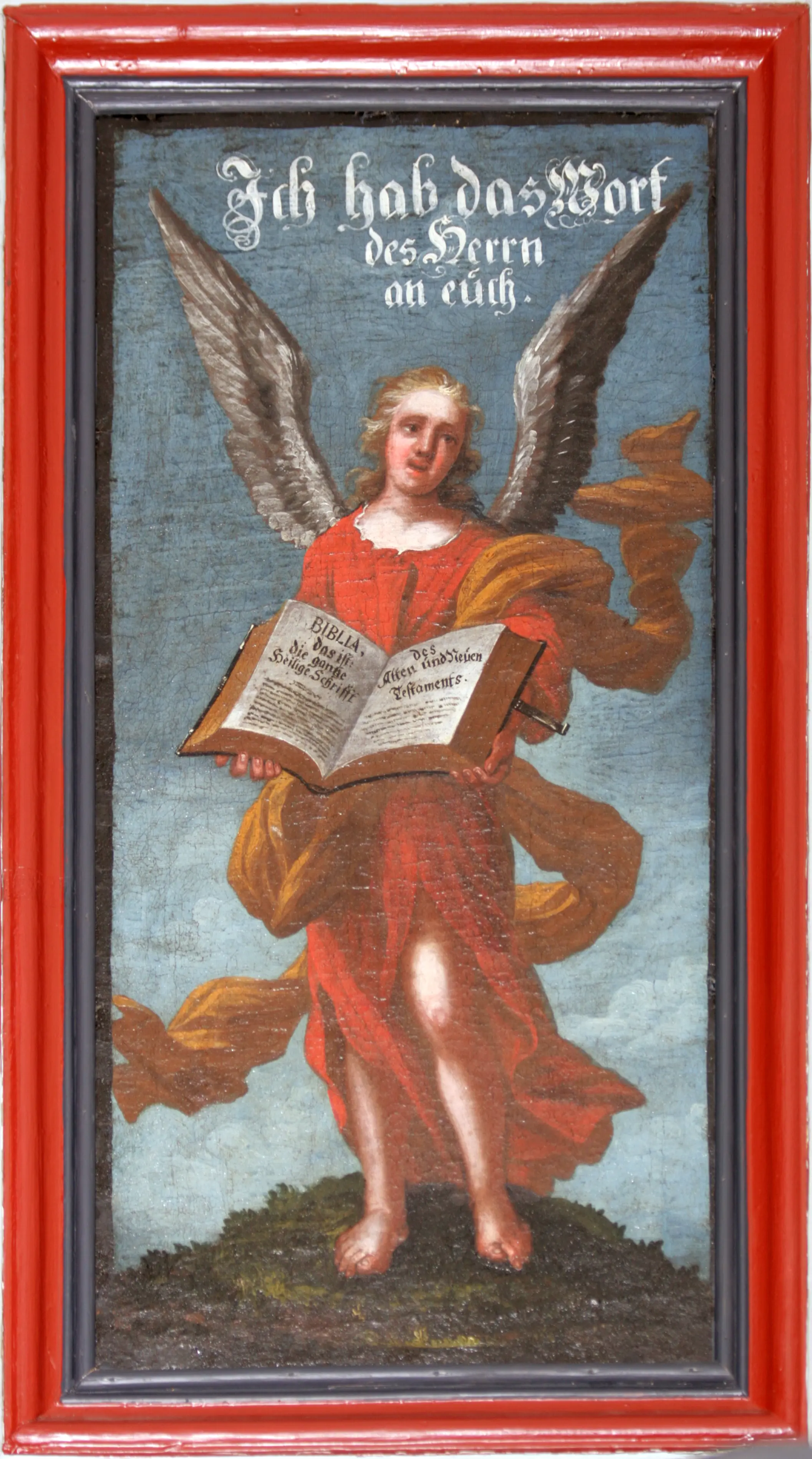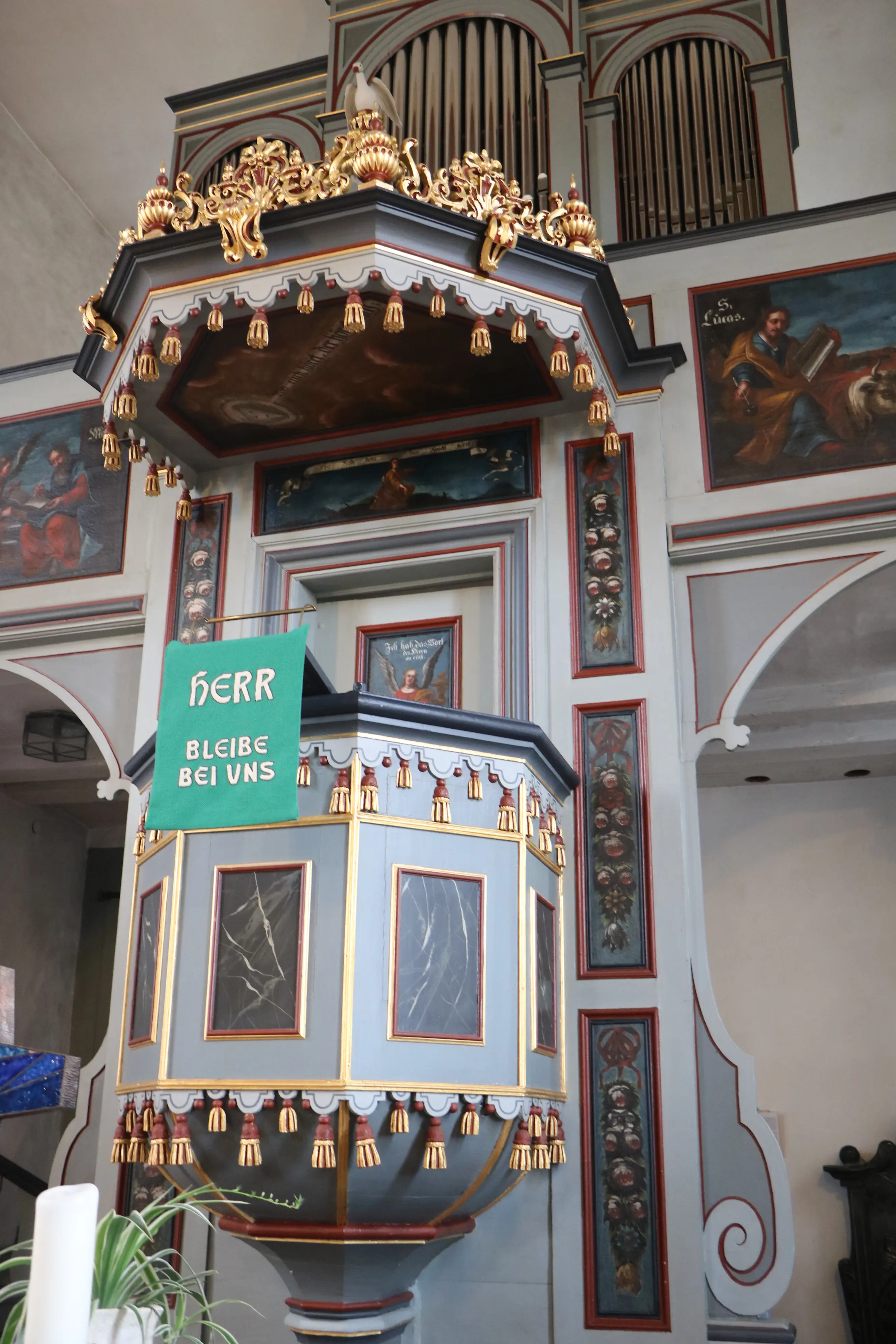 Altar, Kanzel und Orgelempore sind gemeinsam entstanden und bilden eine materielle und funktionale Einheit. Der Altartisch ist relativ einfach gestaltet und zeigt auf der Vorderseite nur ein mit einem vergoldeten Blattzierfries umrahmtes Feld. Die Altarplatte ist aus schwarzem Marmor mit weißer Äderung. Eine ovale Vertiefung in der Oberfläche nahm ursprünglich eine Messingschale mit Deckel auf, die das Taufwasser aufnahm. So sind die wichtigsten Ausstattungstücke in einer Einheit und in der Hauptachse der Kirche versammelt: der Altar, der für das heilige Abendmahl steht, die beckenartige Aussparung für die Taufe, die Kanzel steht für das zentrale Element des protestantischen Gottesdienstes, die Predigt. Über allem erhebt sich die Orgel, die als musikalische Stimme den Gottesdienst erhöht und verschönt. Die Kanzel ist reich und kostbar verziert mit Schabrackenbordüre mit vergoldeten Ziertroddeln. Den Schalldeckel schmücken Eckvasen und reicher, plastischer Muschel- und Volutendekor, eine weiße Heilig-Geist-Taube sitzt auf dem zierlich ausgearbeiteten Abschlussknauf. Der fünfseitige Kanzelkorb besitzt eine eher schlichte, teilweise marmorierte Felderung. Der obere Kanzelbereich wurde gleich der Emporenbrüstung mit figürlichen Darstellungen und Blütengehängen bemalt. Die Kanzeltür, die durch eine erhaltene barocke Treppe mit Brettbalustern auf der Rückseite zugänglich ist, wurde mit dem Bild eines Engels, der eine geöffnete Bibel hält, geschmückt. Darüber steht: „Ich hab das Wort des Herrn an Euch“. Auf dem schmalen Feld oberhalb der Tür ist die Darstellung eines knienden Mannes. Das darüber gemalte Schriftband trägt die Inschrift: „Herr, rede, denn dein Knecht höret“. Auch die Unterseite des Schalldeckels ist bildlich verziert: hier ist ein lichtdurchflutetes Dreieck mit drei roten Flämmchen abgebildet: dies ist das Symbol des dreieinigen Gottes, hiervon ausgehend ist die Inschrift „Wer Euch höret, der höret mich“ zu lesen. All diese verschiedenen Bilder und Texte der Kanzel thematisieren je auf ihre Weise die Bedeutung und die Wichtigkeit des Gotteswortes und dessen Verkündigung. Auch die biblischen Autoren selbst sind dargestellt: Auf den Brüstungsfeldern der Orgelempore zeigen (von links nach rechts) Markus mit dem Löwen, Matthäus mit dem Engel, Lukas mit dem Stier und Johannes mit dem Adler. Die Gemälde von Kanzel und Orgelempore wurden gleich der Gemeindetribüne von Seekatz geschaffen.