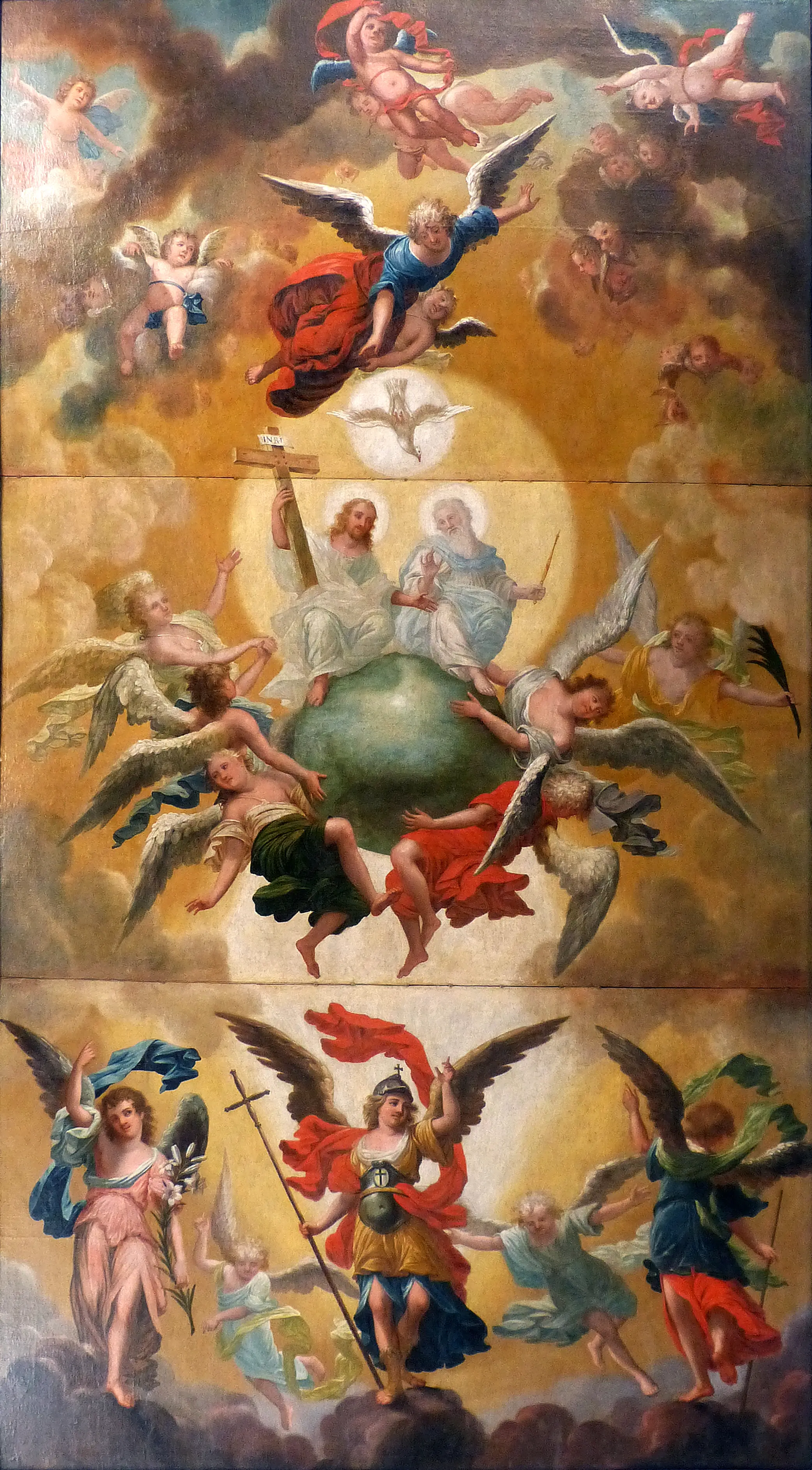 Die Deckengestaltung besteht aus zwei, gestalterisch und technisch unterschiedlichen Bereichen: dem zentralen Deckenspiegel, der durch ein riesiges Ölgemälde auf insgesamt drei Leinwänden gebildet wird, und den äußeren, umrahmenden Partien, bei denen die Farben direkt auf die hölzerne Deckenkonstruktion aufgetragen wurden. Ganz typisch für die barocke Illusionskunst wurde malerisch die raumabschließende Wirkung der realen Decke aufgehoben und dem Betrachter einen Blick in einen Raum jenseits der Decke vorgespiegelt. Dieser wurde im wörtlichen wie übertragenen Sinn als „Himmel“ gestaltet: in realistisch gemalten Wolkenformationen erscheint die Vision des spirituellen Jenseits mit Engeln, die - in unserem Fall - die Heilige Dreifaltigkeit umgeben. Die Dreierstückelung der Leinwände tritt auch in der Komposition des Gesamtbildes zutage: die Mitte wird vom dem zentralen Thema, der Trinität eingenommen: Gottvater als bärtiger Greis und Jesus mit einem Kreuz in der Hand thronen auf einer großen, von sechs Engeln getragenen Weltkugel – darüber schwebt die Taube des Heiligen Geistes. Alle Personen der Heiligen Dreifaltigkeit werden von einem leuchtenden Kreis – einem umfassenden Heiligenschein – hinterfangen. Die obere Leinwand zeigt weitere fliegende Engel und mehrere Putti, die in den Wolken schweben. Das untere Drittel zeigt drei, auf dunklen Wolken stehende Engelsfiguren. Die zentrale Himmelsfigur ist durch Harnisch und Kreuzstab als Erzengel ausgewiesen - das Fehlen weiterer Attribute lässt jedoch eine genauere Identifikation nicht zu. Wohl um der malerischen Abwechslung willen hat der Künstler den rechten Engel in der Rückenansicht gezeigt. Auch zwischen den großen Engeln schweben mehrere kleinere Himmelswesen. Die zentrale Bilddarstellung wird durch rahmende Ornamentbordüren in die Deckenfläche eingebunden. Auch der Übergang zu den Wänden ist mit Zierstreifen geschmückt. Das farbenprächtige Deckengemälde wird dem italienischen Maler Lazarus Maria Sanguinetti zugeschrieben, einem der vielen „welschen“ Künstler, die aus ihrem Heimatland in die Fremde zogen, um dort zu arbeiten. Da die italienische Kunst im 18. Jahrhundert sehr bewundert und in Deutschland hoch geschätzt wurde, beriefen zahlreiche Adels- und Fürstengeschlechter dortige Künstler, vor allem Maler, um ihre Schlösser und Kirchen auszuschmücken. Einer der berühmtesten von ihnen, Gianbattista Tiepolo (1696-1770) wurde etwa vom Würzburger Fürstbischof beauftragt, seine Stadtresidenz mit Fresken zu schmücken. Viele der kleineren Herrschaften eiferten dem nach – konnten jedoch aus finanziellen Gründen nicht die ganz großen Meister über die Alpen locken. L. M. Sanguinetti stammte vielleicht aus Genua, seine Lebensdaten sind nicht bekannt. Er war ein viel beschäftigter Mann, dessen ersten bekannten Werke in Böhmen entstanden (Fresken im Weißen Schloss in Schlackenwerth (1692-95). Desweiteren sind Fresken von ihm im Schloss Montabaur (1696), Schloss Philippsburg bei Ehrenbreitstein (1712), Schloss Elisabethenburg in Meinigen (1714) u. a. erhalten. Im Weilburger Schloss malte er 1709 das Deckenfresko des Kurfürstenzimmers. Sein letztes eindeutig bezeugtes Werk entstand bereits 1728, also zehn Jahre vor dem Löhnberger Deckenbild, was seine Urheberschaft fraglich erscheinen lässt. Nur eine eingehende Stilanalyse seiner gesicherten Werke mit dem Löhnberger Gemälde könnte die Zuschreibung an Sanguinetti klären.
